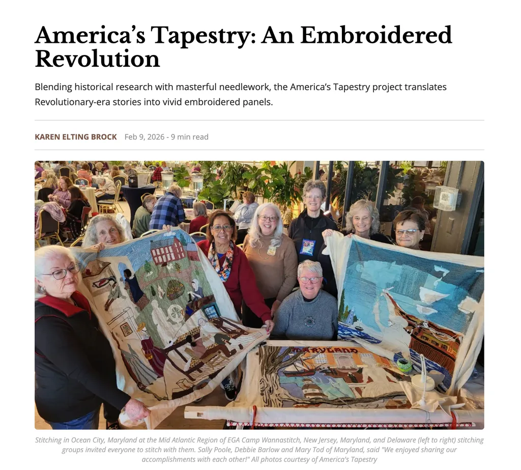 Welcome to 2026 - our nation's anniversary year! Winter events across the 13 states, from Valley Forge to the Peabody Historical Society, bring communities together through needlework.