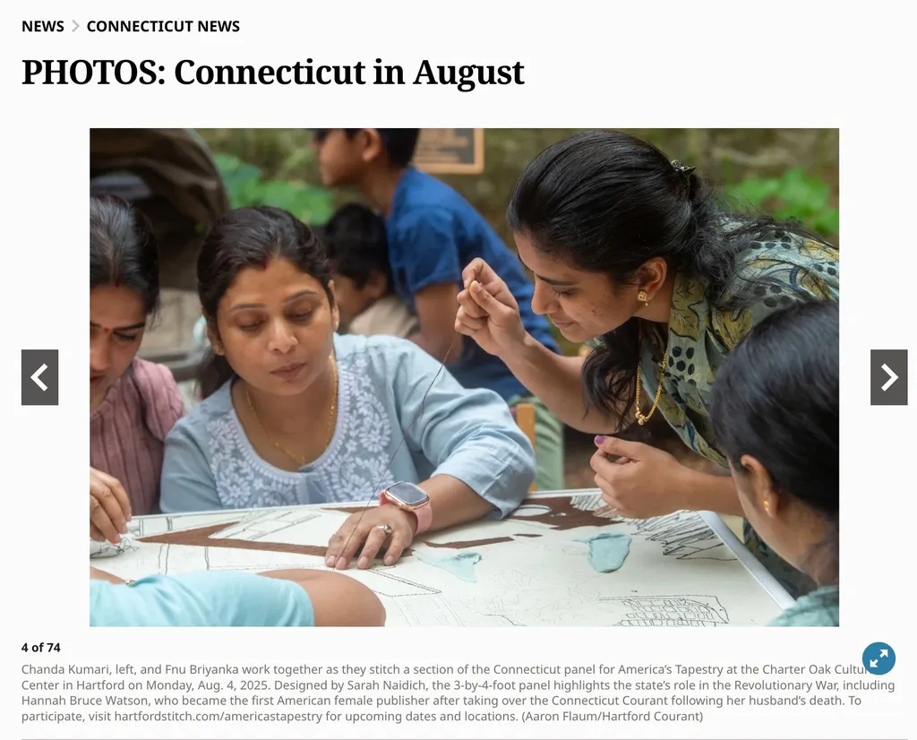 The Hartford Courant documented the Connecticut Tapestry Panel at the Charter Oak Cultural Center in Hartford this August as volunteers Chanda Kumari and Fnu Briyanka stitched outdoors. The state panel features Hannah Bunce Watson, the first female editor of the Hartford Courant (then called the Connecticut Courant)!