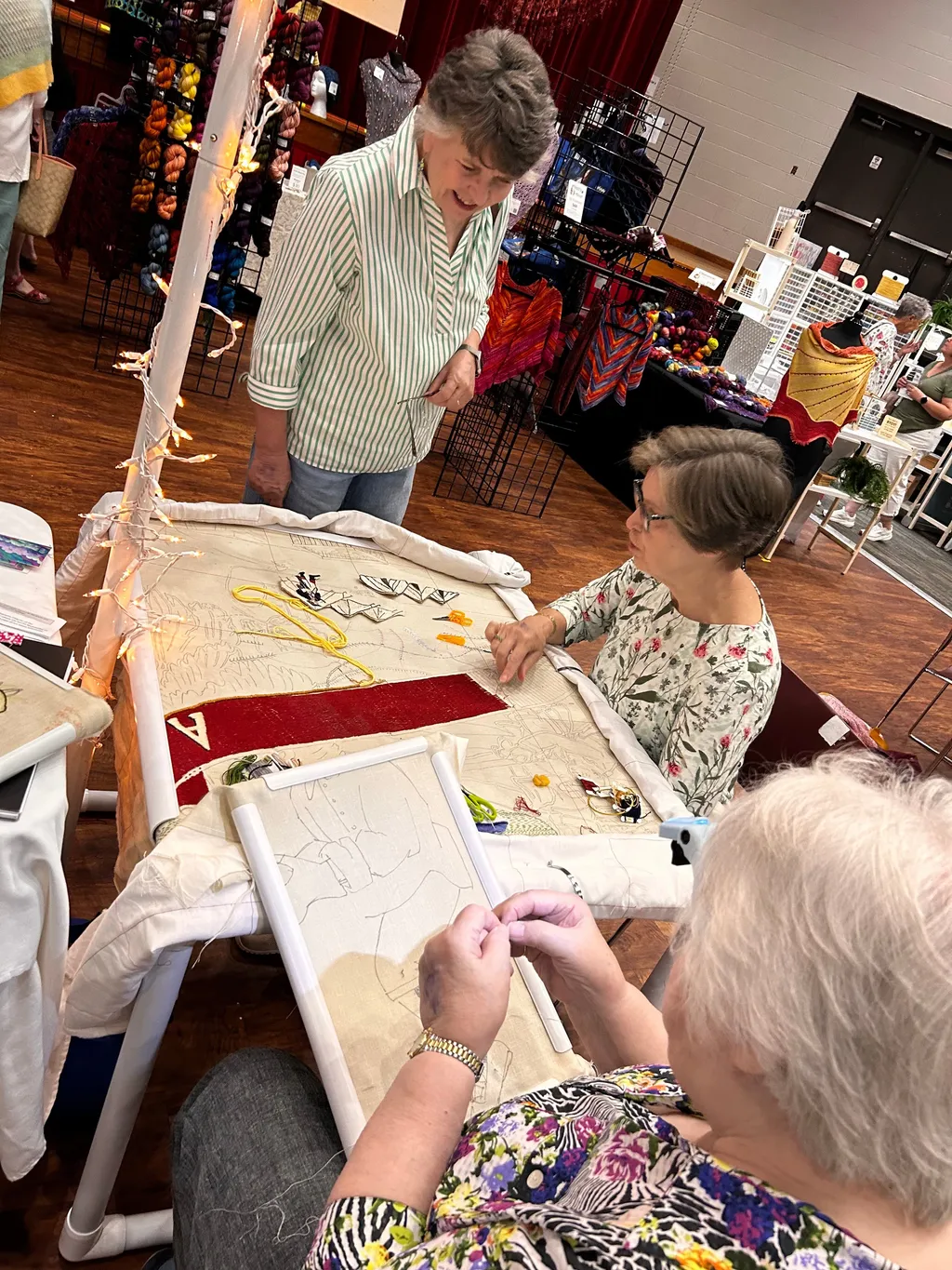 North Carolina director Gail Smith and South Carolina director Karen Wallach attended the Southern Comforts Fiber Market in Charlotte, NC for a weekend in August. Thank you to all our wonderful volunteers who came out to stitch with us!